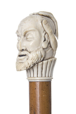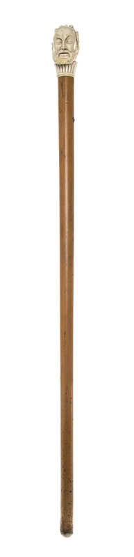 19th century, having a carved handle in the shape of a bearded man's head being held by an oversized hand from behind, having a malacca shaft with brass eyelets.