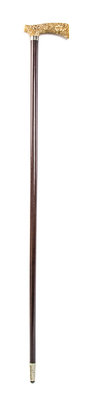 having a foliate decorated L shaped handle with a sterling silver collar on a rosewood shaft, ending in a silvered ferrule and steel tip.
