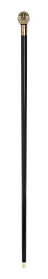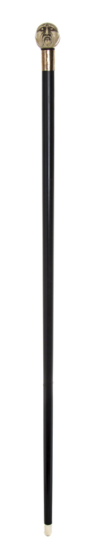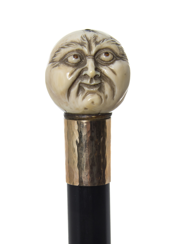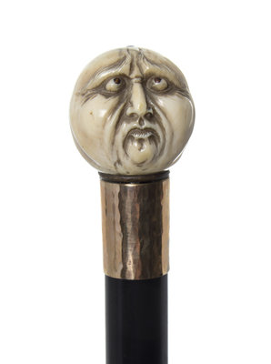 late 19th century, having a carved handle depicting a happy face on one side and a sad face on the other, each side having red coral inlaid eyes, the top of the handle having a scrimshawed insect with black coral inlay, indicating a signature, having a hammered gold-filled collar with an ebony shaft ending in an ivory tip.