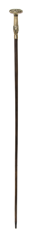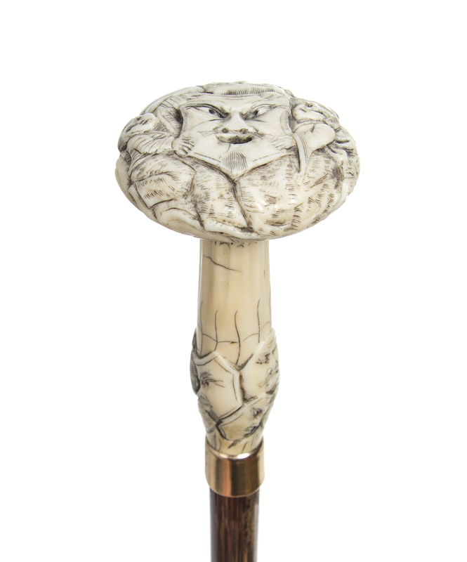 late 19th century, having a Japanese mushroom shaped handle with low relief images of Noh masks, with a 14 karat gold collar on a palmwood shaft, ending in a German sterling silver ferrule and a steel tip.
