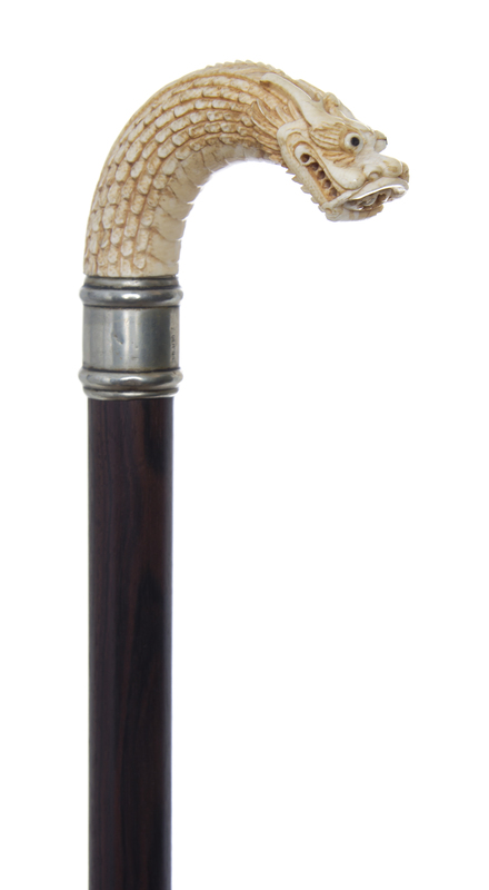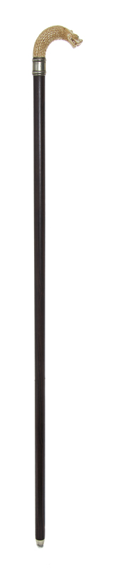 having a crook handle carved in the shape of a dragon, the collar marked Ger Sil on the rosewood shaft, ending in a German silver ferrule and a steel tip.