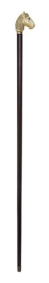 having a horse shaped handle with a gold-filled collar on an exotic wood shaft, ending in a brass ferrule and a steel tip.