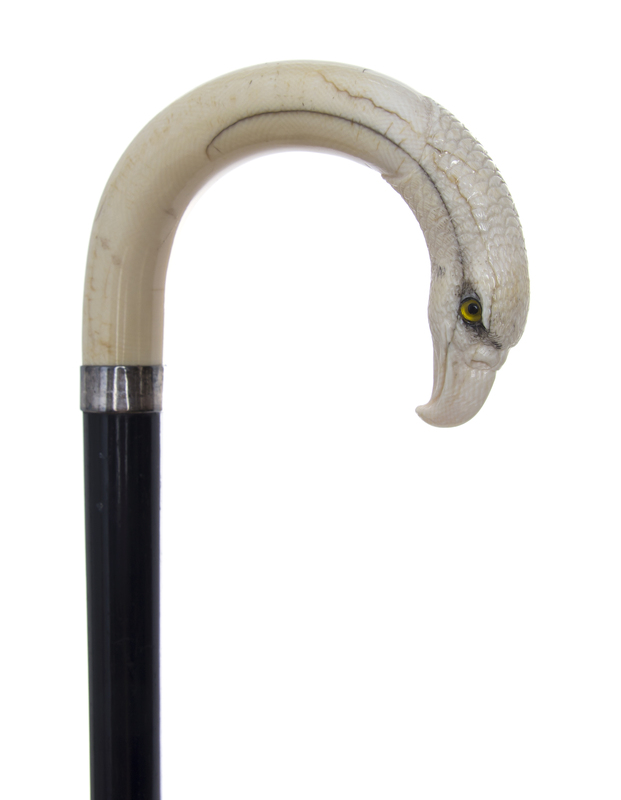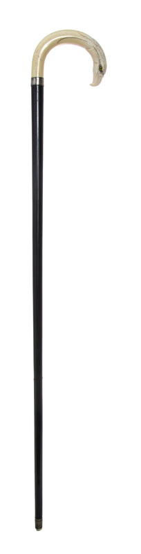 having a crook form handle ending in a carved eagle's head with inset glass eyes with a silver collar on an ebonized shaft, ending in a brass ferrule and steel tip.