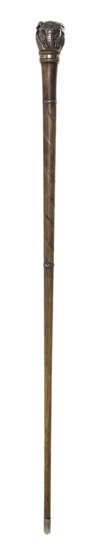 late 19th century, having a cast handle depicting an elephant with inlaid gemstone eyes and a cabochon lid catch, with a silver collar on a hardwood shaft with two cast silver laurel leaf bands connected by a flat silver inlaid chain.