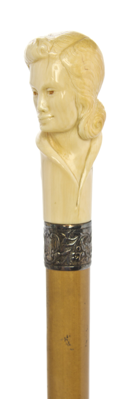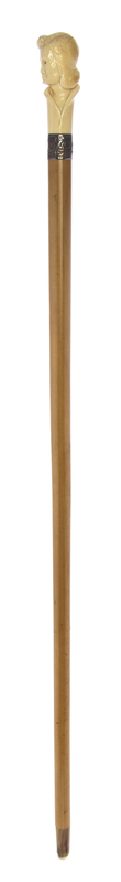 early 20th century, the handle carved as the bust of a lady, with a sterling silver collar on a malacca shaft, ending in a horn tip.