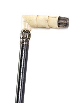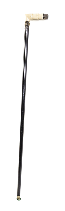 late 19th century, having a stepped L shaped handle with a sterling silver collar on the ebonized shaft, ending in a German silver ferrule and a replaced cap.