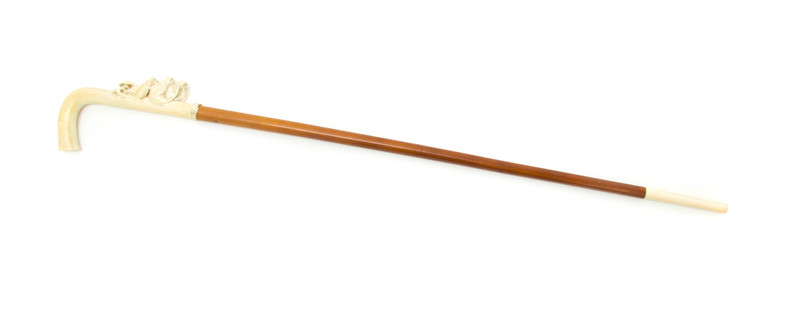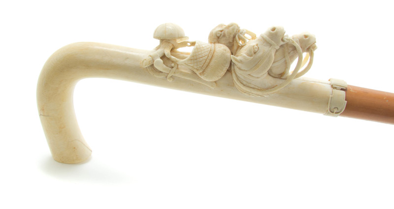 having an L-form handle with decoration relating to the hunt, including a cap, knife and scabbard, bag, hound's head and two horse heads ending in a belt carved collar, over the malacca shaft terminating in an ivory ferrule.