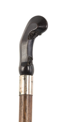20th century, having a 4 inch tall Balinese carved sword hilt for a handle, the 23 3/8 inch blade of foil shape stamped Made in France, with a sterling silver collar on a rosewood shaft, ending in a German silver tip.