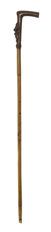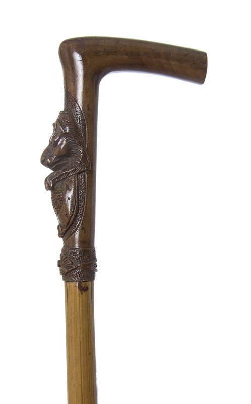 mid-19th century, having a wood handle with a heraldic lion carved in high relief, with a hidden button release revealing a diamond cross section Spanish blade, marked Toledo, the blued upper half with alternating panels and scroll works, with a reed shaft ending in a painted metal ferrule style cap for the tip.