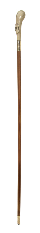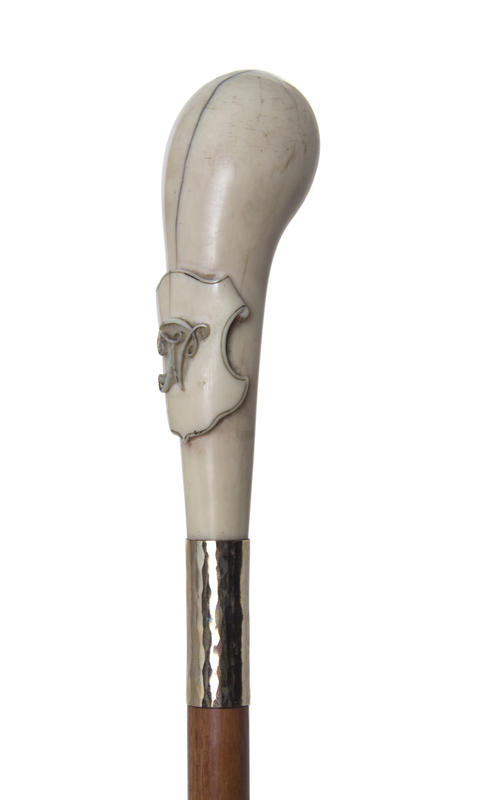 late 19th century, having a pistol grip handle with a shield centered with an N in relief, with a hammered gold-filled collar on a tulipwood shaft, ending in a matching ferrule and a steel tip.