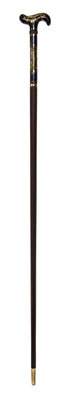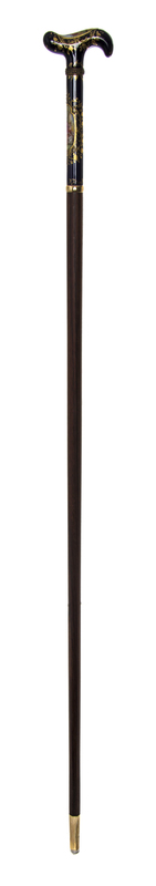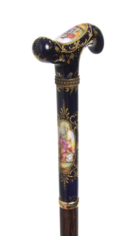 depicting a courting couple on a cobalt blue ground, with a gold-filled collar on a cocobolo shaft, ending in a gold-filled ferrule and steel tip.