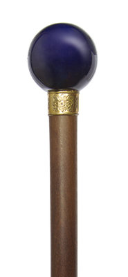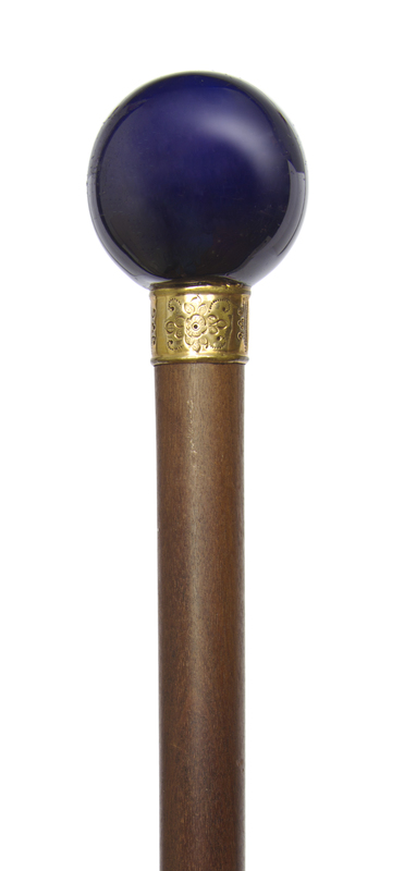 late 19th century, having a cobalt spherical handle with a chased gold-filled presentation collar on a rosewood shaft, ending in a German silver and brass tip.