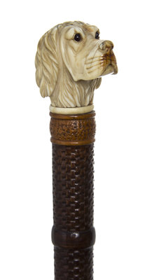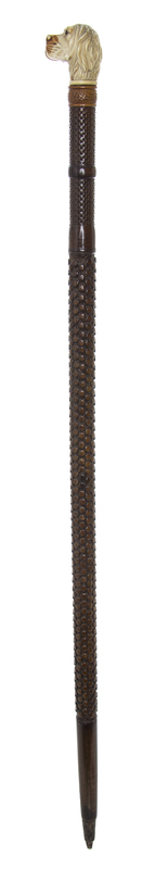 having a dog shaped handle with garnet eyes, with a wood collar on a carved wood shaft ending in a steel ferrule.