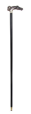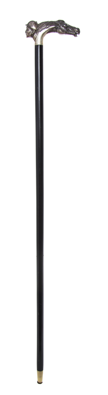 circa 1920's, having a tau shaped handle shaped as a horse head opposite a jockey head, stamped Sterling A.C., having an ebonized shaft ending in a horn tip.