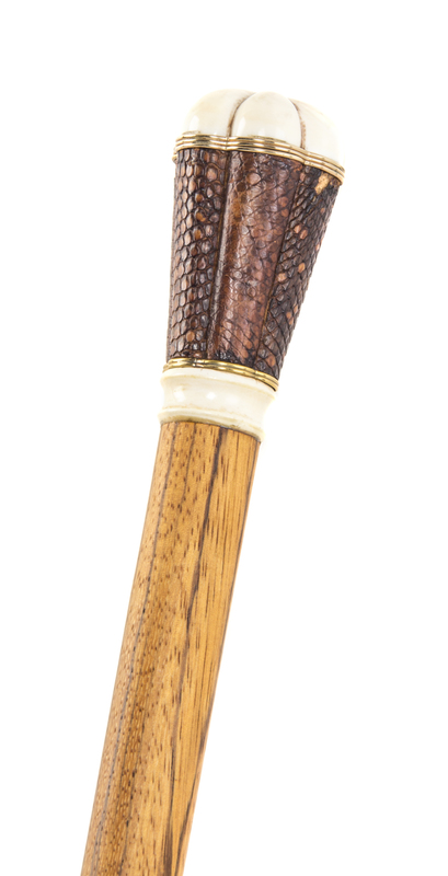 having six panels of snakeskin wrapped at the top and bottom with gold-filled wire on a zebrano wood shaft, ending in a brass and steel tip.