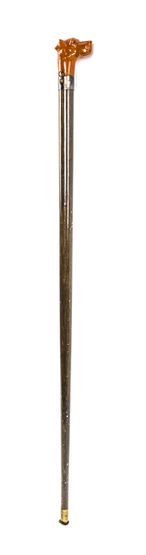 1930's, having a dog's head form handle with glass eyes, the handle having two swivels mounted on either side of the neck for a leather cord that is now missing, with a sterling silver collar on the hardwood shaft, ending in a brass ferrule.