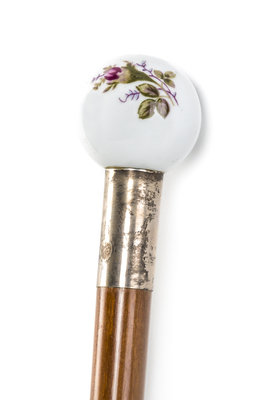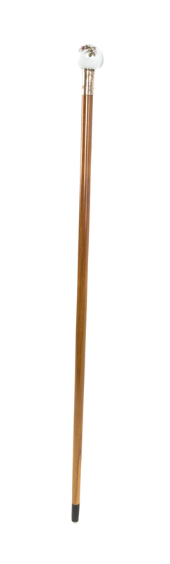 late 19th century, having a spherical handle decorated with flowers on a white ground, with a sterling silver collar on an osage orange shaft, ending in a horn tip.