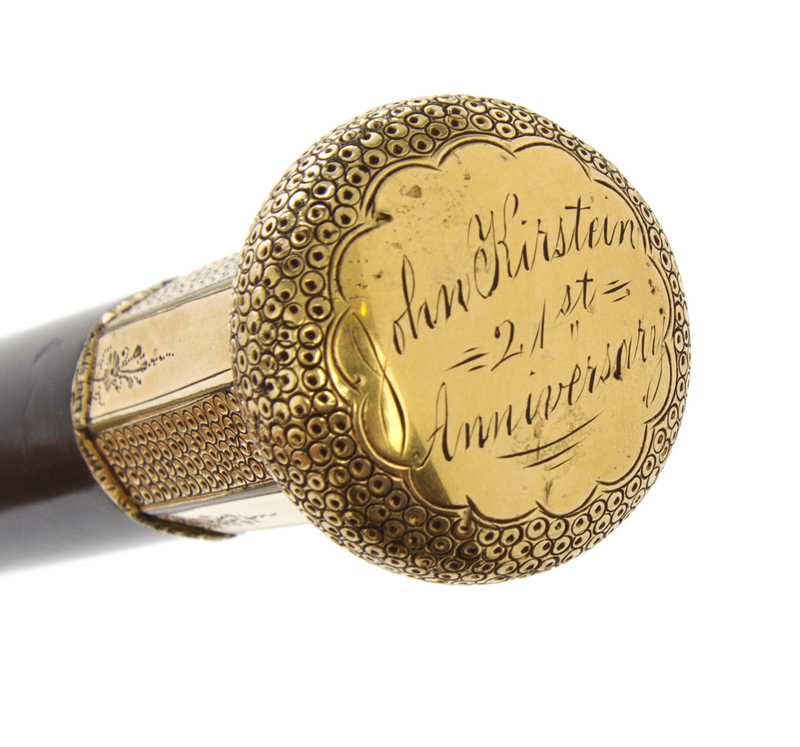 mid to late 19th century, having a knob handle engraved John Kirstein/ 21st/ Anniversary, with an ebonized shaft ending in a German silver ferrule and a steel tip.