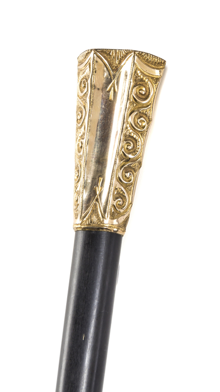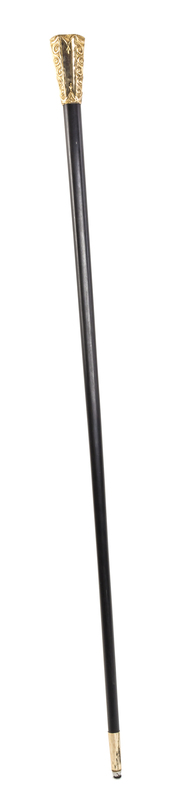 late 19th century, having a gold-filled handle of trapezoidal form with two middle panels with deep flutes, having an ebony shaft of round tapering form ending in a gold-filled ferrule and a steel tip, hallmarked F.C. & Co.