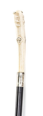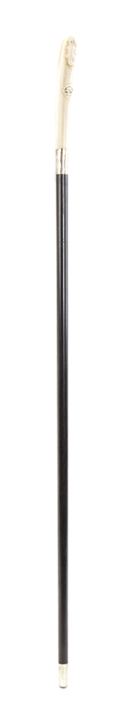 late 19th century, having a carved handle depicting two polar bears and two Biliken masks in low relief, having a sterling silver collar on an ebony shaft, ending in a sterling silver ferrule and a steel tip.