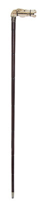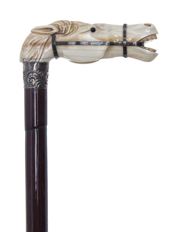 mid-19th century, having an L shape handle shaped as a horse head with glass inlaid eyes and sterling silver bridle straps, having an embossed sterling silver collar on a hardwood shaft carved in imitation of stepped malacca, ending in a German sterling silver ferrule and a steel tip.