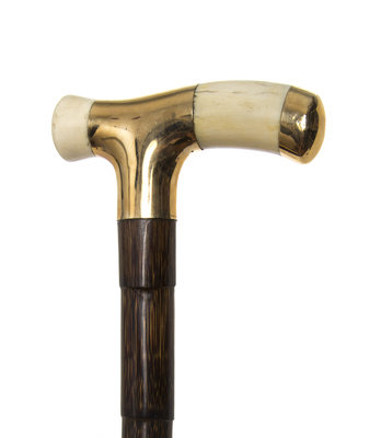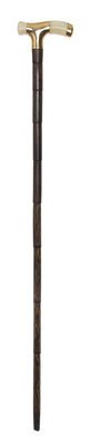 early 20th century, having a tau shape handle with a 14 karat gold overlay wrapped around the handle and collar, raised on a reed shaft ending in a horn tip.