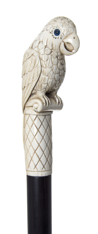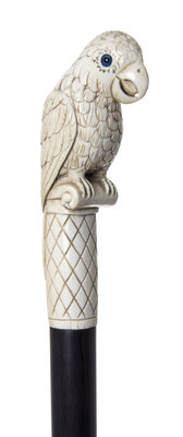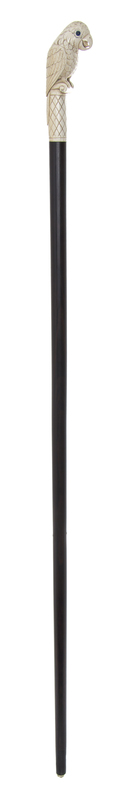 20th century, having a carved handle in the shape of a parrot on a scrolled perch with inlaid blue glass eyes, having a rosewood shaft without a tip.