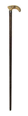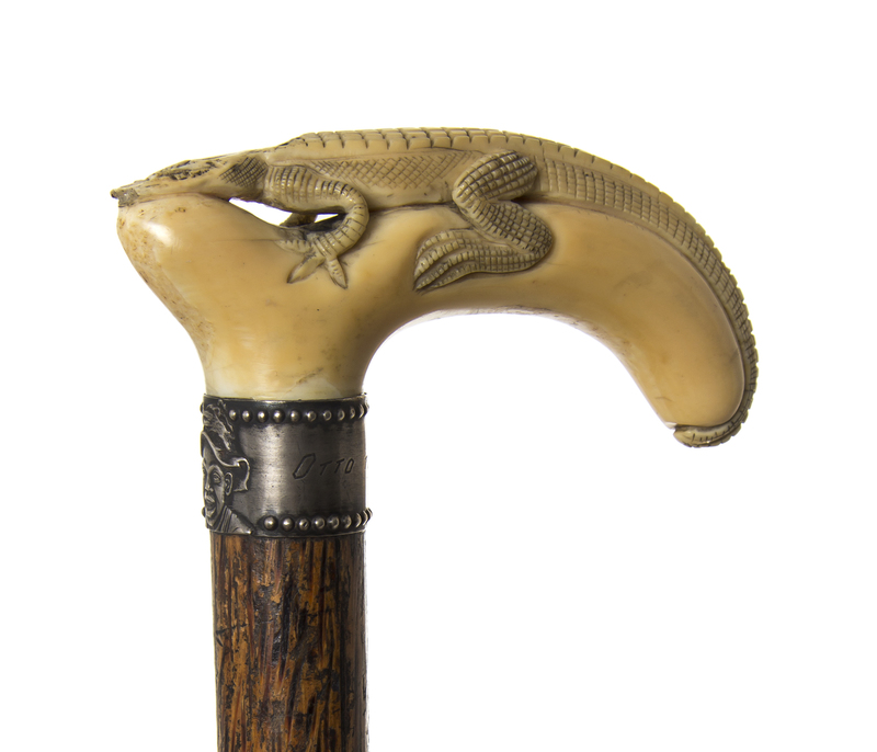 late 19th century, having a crook handle carved with an alligator in high relief, with a sterling silver collar depicting a Black Americana boy in a hat, indicating a maker's mark, and engraved Otto to Max, on an wenge shaft, ending in an iron ferrule.