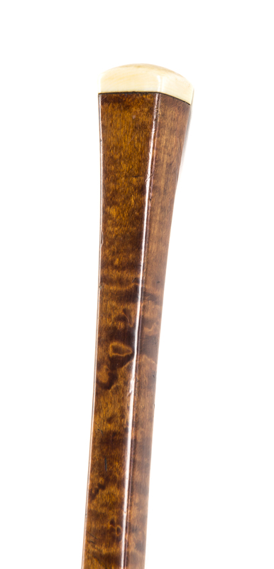 late 19th century, having a square shaped handle with a bird's eye and curly maple square tapering shaft, ending in a brass ferrule and a steel tip.