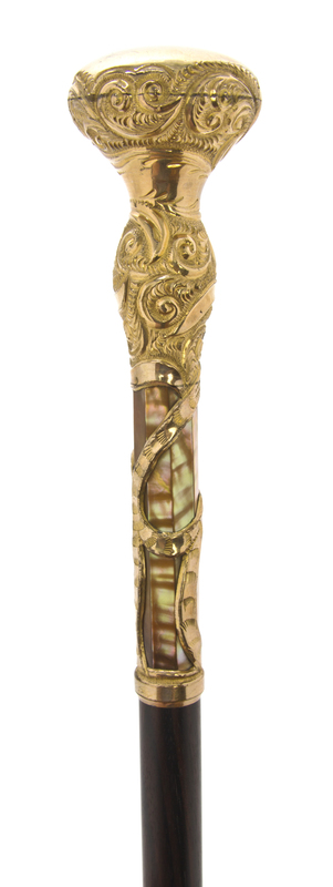 late 19th century, having a knob handle overlaid on strips of gold inlaid mother-of-pearl, with a Macassar ebony shaft, ending in a brass and steel tip.