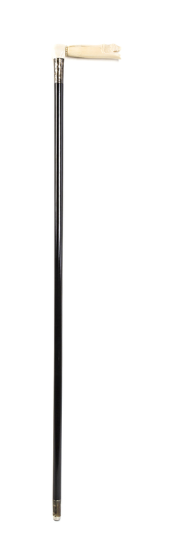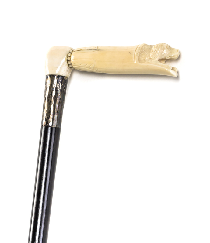 late 19th century, having an L shape handle in the shape of a dog's head, with a hammered silver collar on an ebony shaft, ending in a silver ferrule and a steel tip.