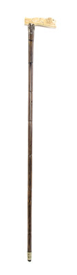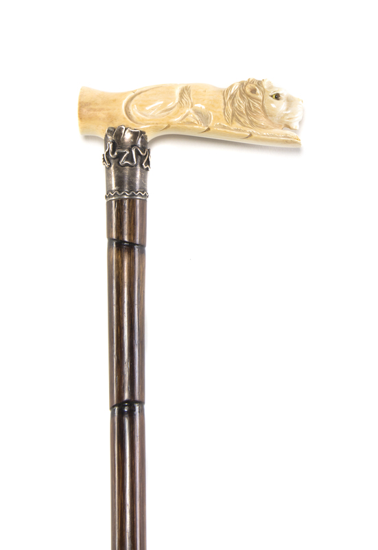 late 19th century, having an L shape handle in the shape of a stalking lion with inlaid glass eyes, with a sterling collar on a stepped malacca shaft, ending in a German silver ferrule and a steel tip.