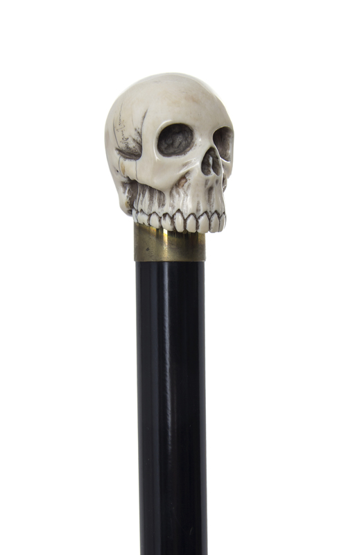 late 19th century, having a carved handle in the shape of a skull, with a brass collar on an ebonized shaft.