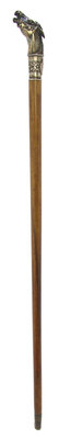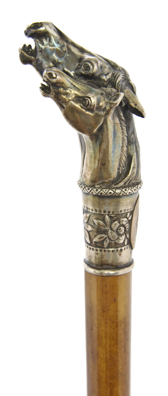 late 19th century, having a figural handle in the shape of a filly and foal head, with a chased floral collar monogrammed S over O on a shield on a malacca shaft, ending in a brass ferrule.