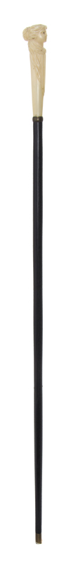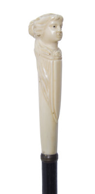 late 19th century, having a carved handle in the shape of a lady's head, with a small brass collar on an ebonized shaft, a spent 9mm shell casing acting as a replacement tip.