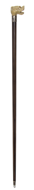 19th century, having a carved handle in the shape of a snarling dog's head with amber inset eyes, with a sterling silver collar on a Macassar ebony shaft, ending in a sterling ferrule and a steel tip.