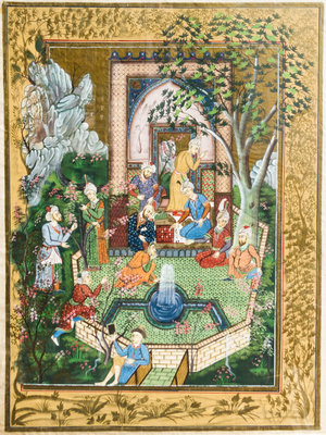 depicting several figures in a courtyard, the central two playing a game of chess, matted and framed.