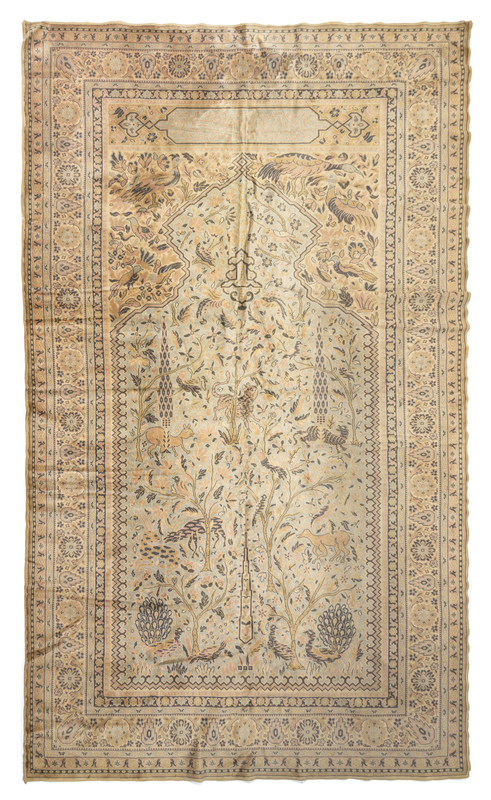 with allover foliate and animal decoration on an ivory reserve within multiple borders, signed.