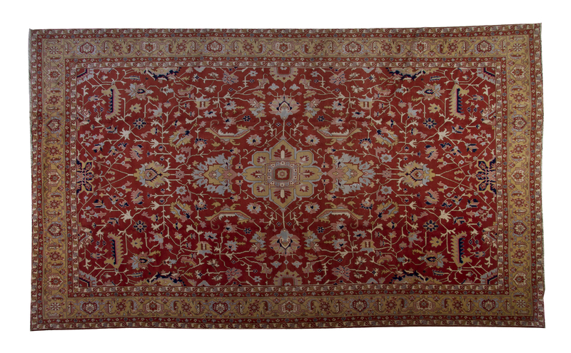 having a stylized floral center on a red field with allover foliate decoration within multiple borders.