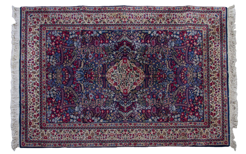 having a foliate decorated center medallion on an allover foliate decorated field within multiple borders.