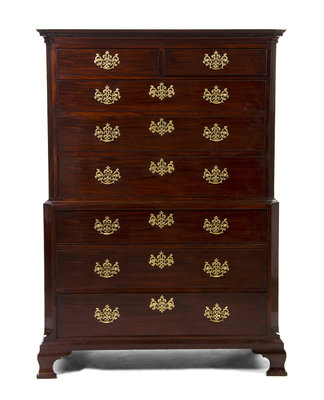in two parts, the superstructure with a dentiled cornice over two short and three graduated long drawers, the base set with three graduated long drawers, the whole raised on bracket feet.