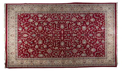 having allover foliate decoration on a red ground within multiple borders.