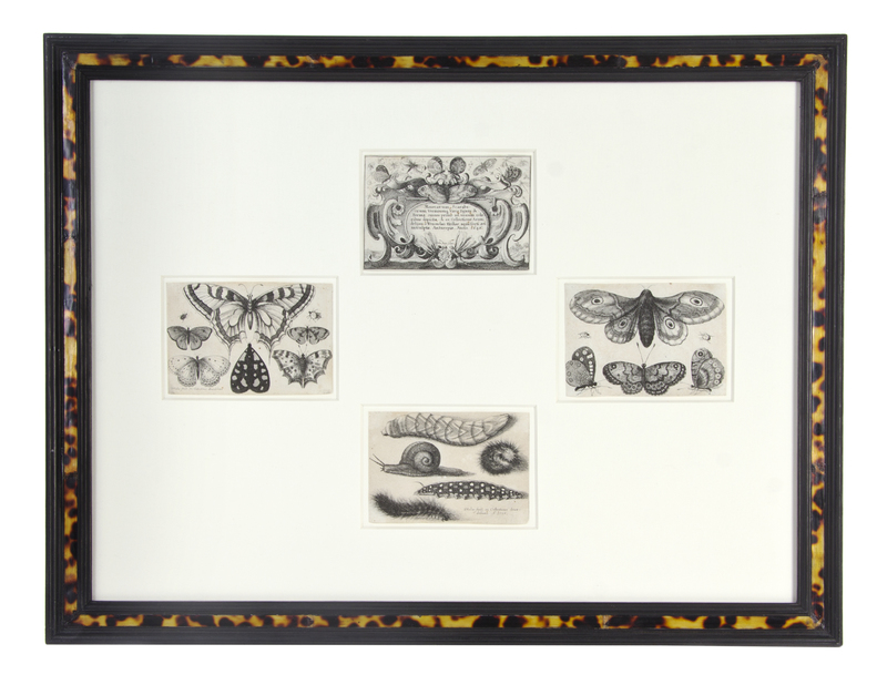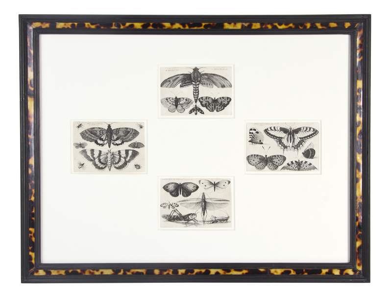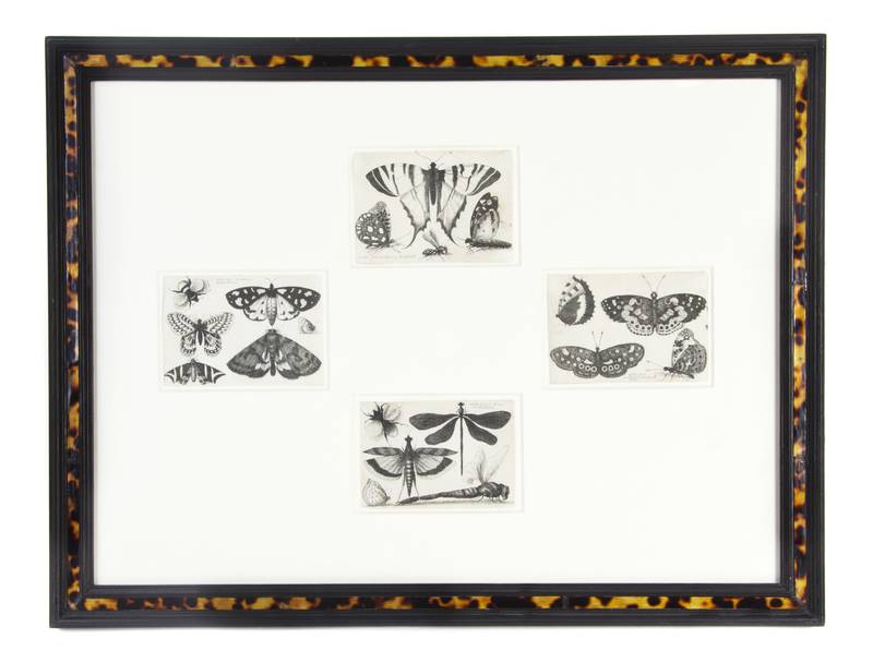 Muscarum Scarabeorum Vermimque Varie Figure et Forma, depicting various species of butterflies and insects, arranged in three groups of four and set in faux tortoise shell frames.