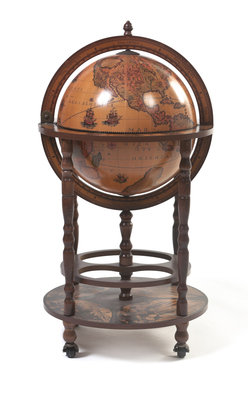 the upper half of the globe hinged, opening to a fitted interior compartment, raised on turned legs, joined by a medial shelf ending in casters.