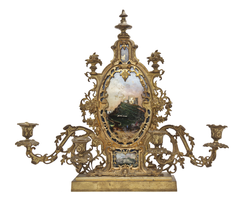 cast with an oval backplate inset with an eglomise panel and surmounted by a toupie finial atop a cupola between urns of fruit and flowers, the openwork candle arms issuing from a stepped rectangular base.