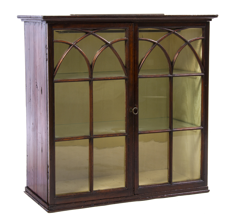 late 18th century, having a molded cornice over two mullion glazed doors opening to an upholstered interior fitted with three shelves.