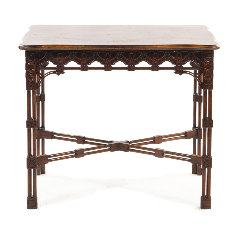 late 19th/early 20th century, having a rectangular top with a serpentine molded edge over pairs of turned legs joined by an X-form stretcher and ending in block feet.
