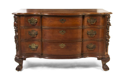 having a shaped rectangular top with a molded edge and canted corners, over the conforming case, enclosing three long drawers, flanked by foliate carved corners, raised on hairy paw feet.