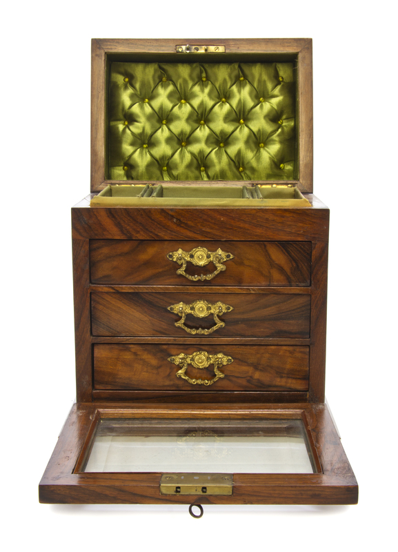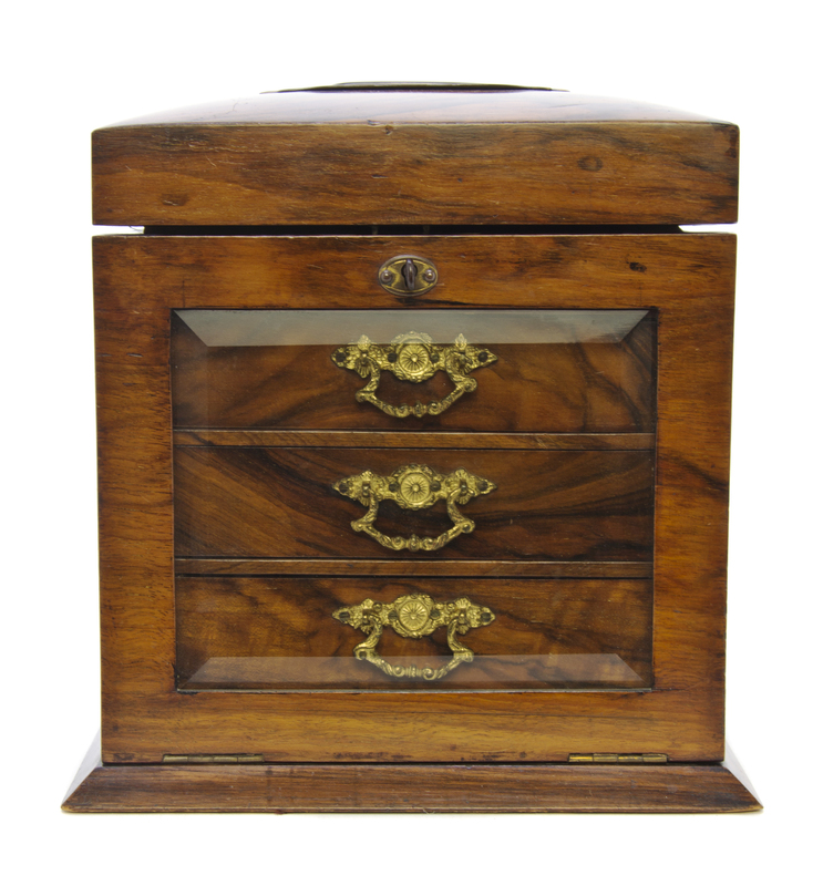 the rectangular hinged top centered with a bail handle lifting to a silk lined interior, the glazed beveled fall front opening to three drawers, also with silk lining.