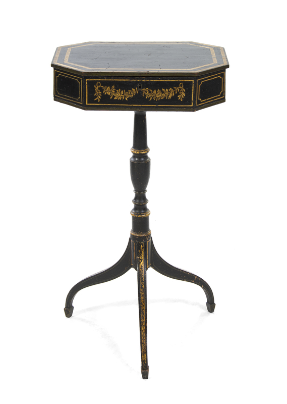 circa 1820, having a hinged elongating octagonal top above a turned column over a tripod base with downswept legs ending in spade feet, with overall gilt decoration on a black ground.